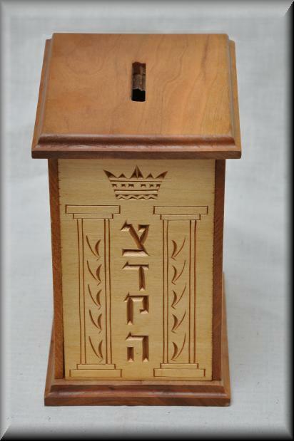 Tzedakah can be described as the giving of charity as part of the process of seeking a just world. It is said that Israel will be redeemed by its acts of charity. Isaiah, as read for the Yom Kippur Haftorah, states "Is this the fast I look for? A day of self affliction?...Is it not to share your bread with the hungry, and to bring the homeless poor into your house?" The charity boxes have Tzedakah carved in Hebrew on the sides and are surrounded by the Temple Pillars and a Crown. The Temple Pillars represent the wisdom of Solomon. The Keter (Crown) Torah represents the crown of a good name for those that give Tzedakah generously.