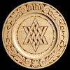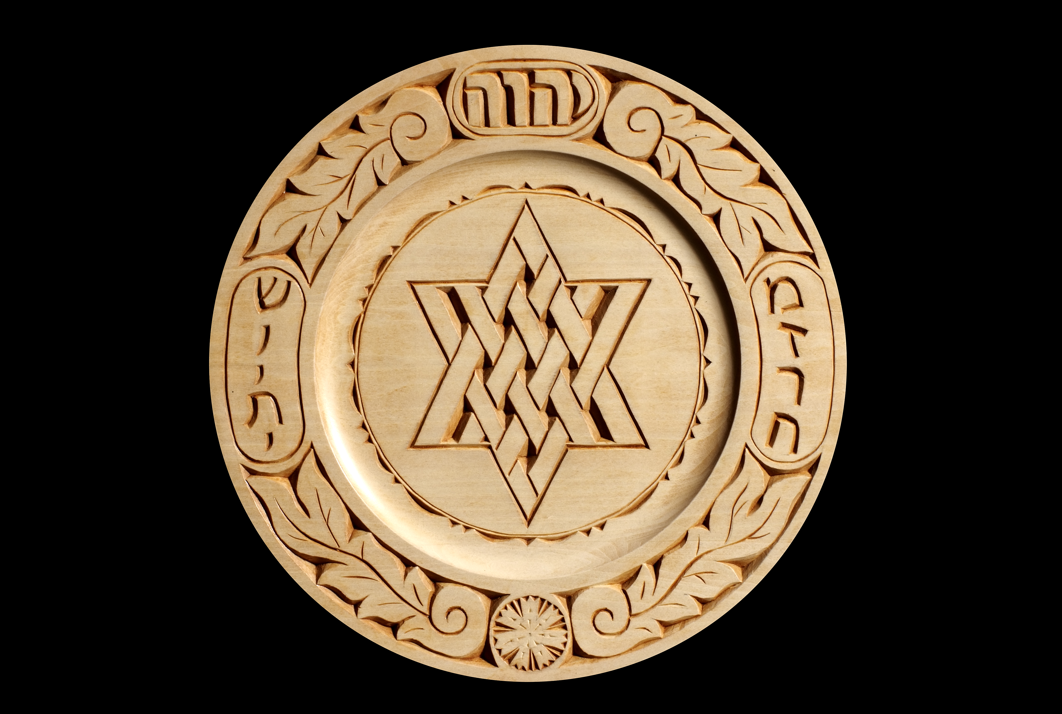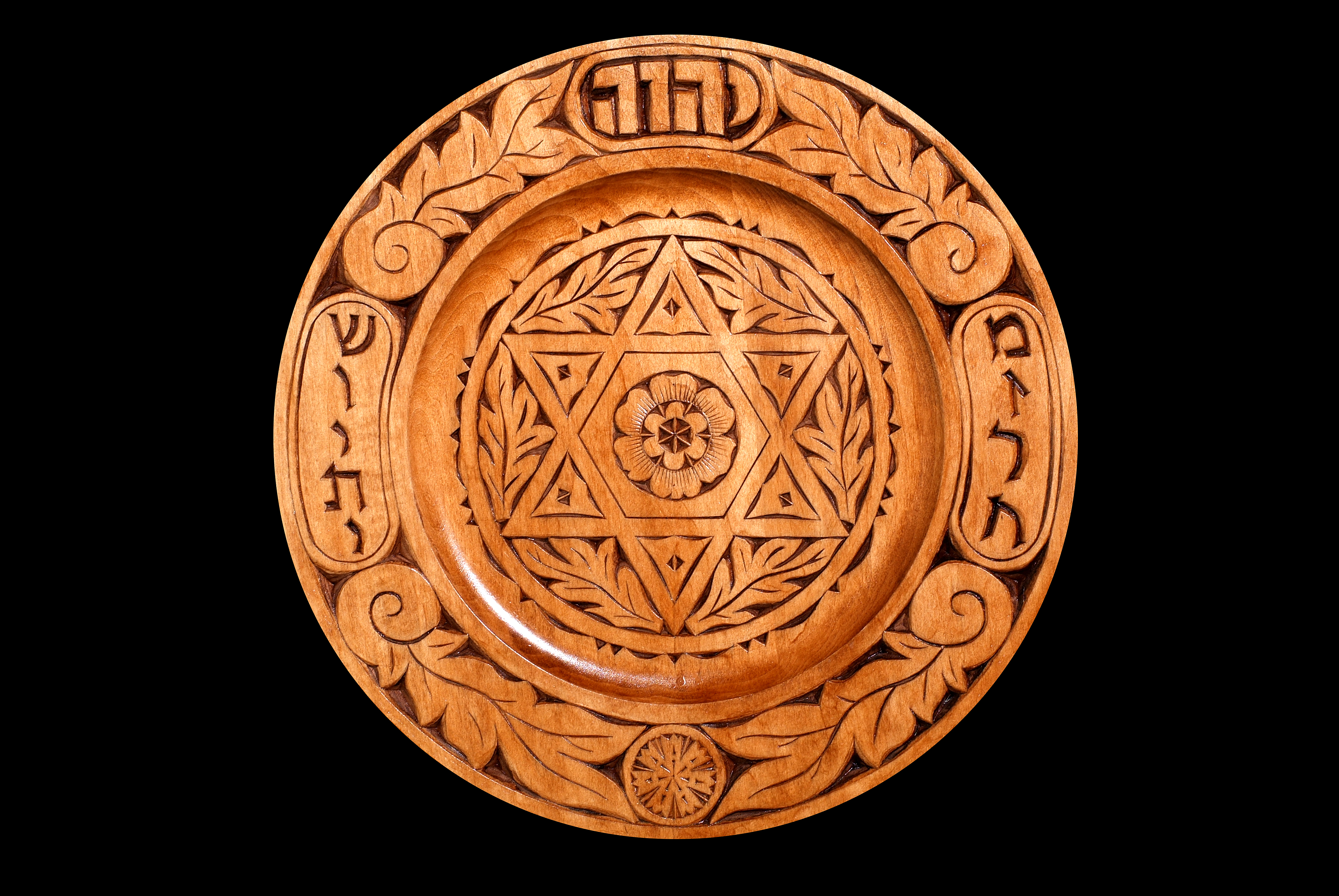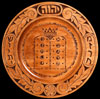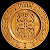 All of these Mizrach/Shvitis are hand carved on a 12 inch round wooden plate using a hand held knife. They are stained, dyed or tinted and finished with a combination of shellac, polyurethane and wax.