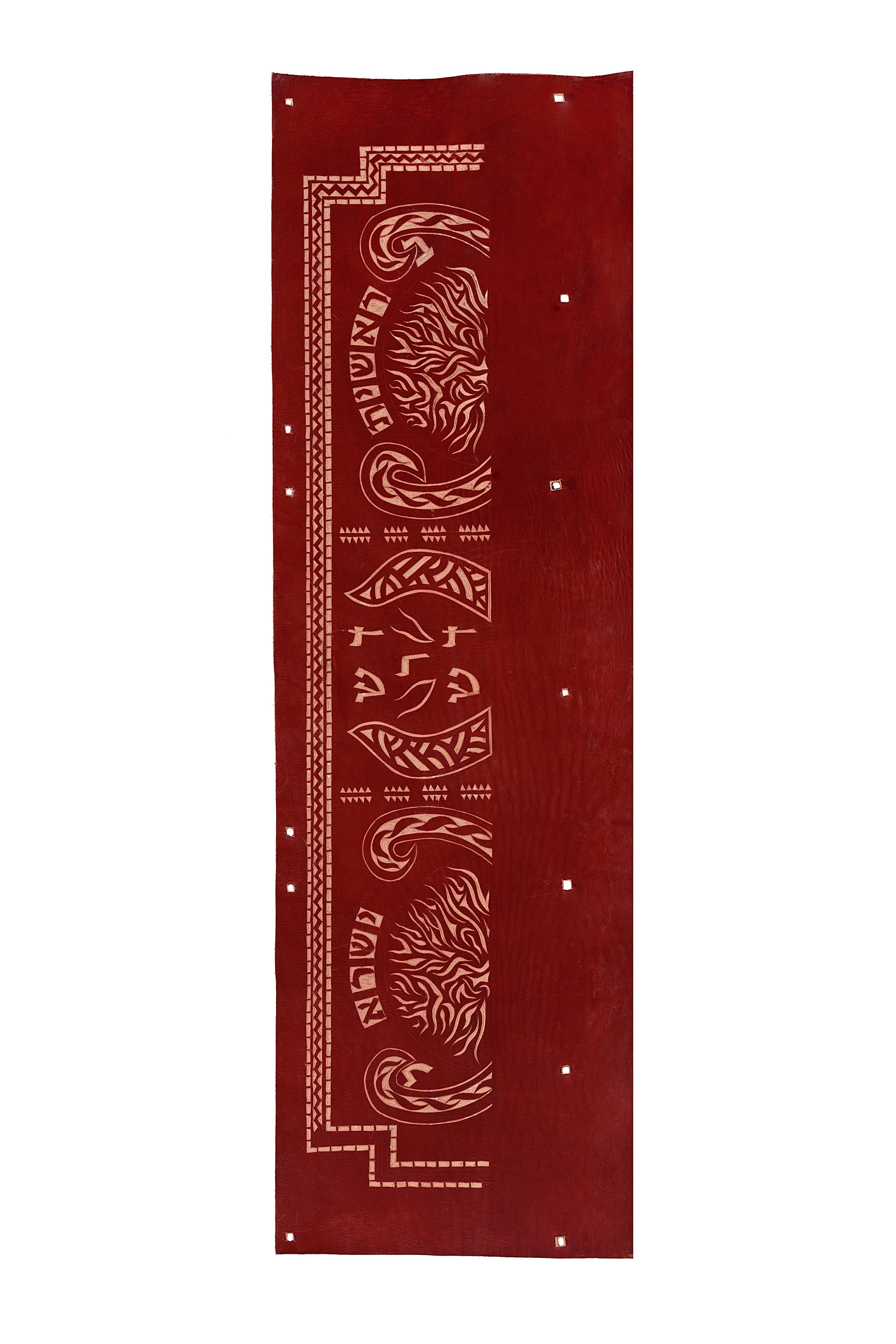 The carving, like the Torah, begins with Breisheet, the Hebrew word for “In the Beginning” . Next comes the middle words in the Torah, Derosh- derash, and finally the last word of the Torah, “Israel”. Between the words are water and fire motifs reflecting the creation of the Torah.