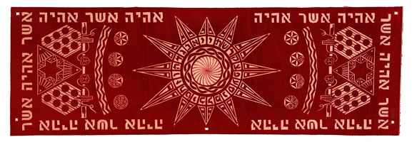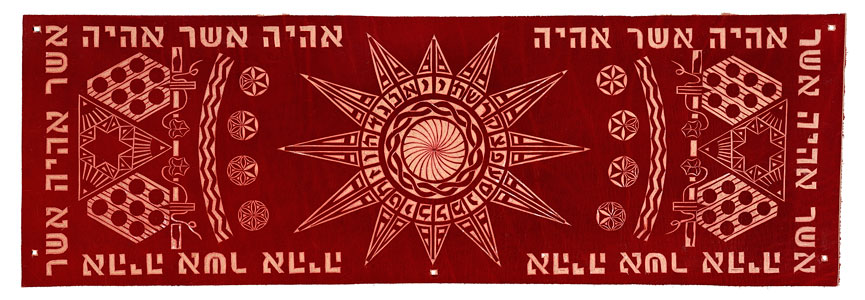 This central panel is also divided into two sections. The top section is bordered with “Ehyeh-Asher-Ehyeh”, the name God reveals to Moses at the Burning Bush. (Exodus 3.14). The center of this top panel represents God as the Creator of the Universe. The sides of this top panel represent God in particular relationship to the Jewish People.