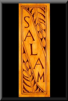 Dimensioned 12" X 4" in bass wood. Exibits carved Dates with "SALAM" (Peace in Arabic).